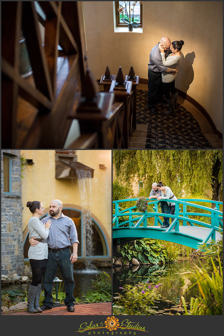 There’s always “firsts” for everything right? Like the first time photographing an engagement session at the beautiful Mirbeau Inn & Spa. The first time photographing a couple who got sick with the flu the morning of their session, the first time we had a groom-to-be describe himself as “grumpy”, and the first time we needed lots of tissues for something other than tears of joy. Also the first time we were a little scared that the groom-to-be might make a run for it when we weren’t looking. He told us he didn’t smile (which we later found to be completely untrue, when he looked at his lovely lady).